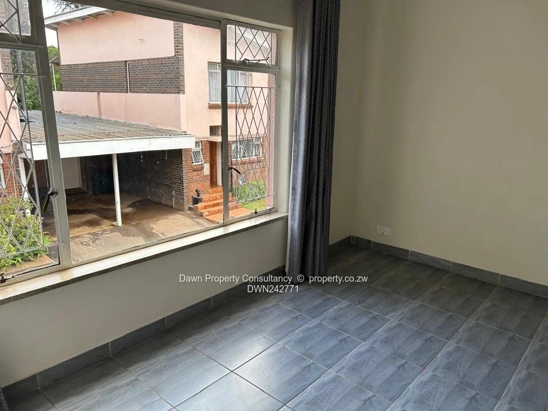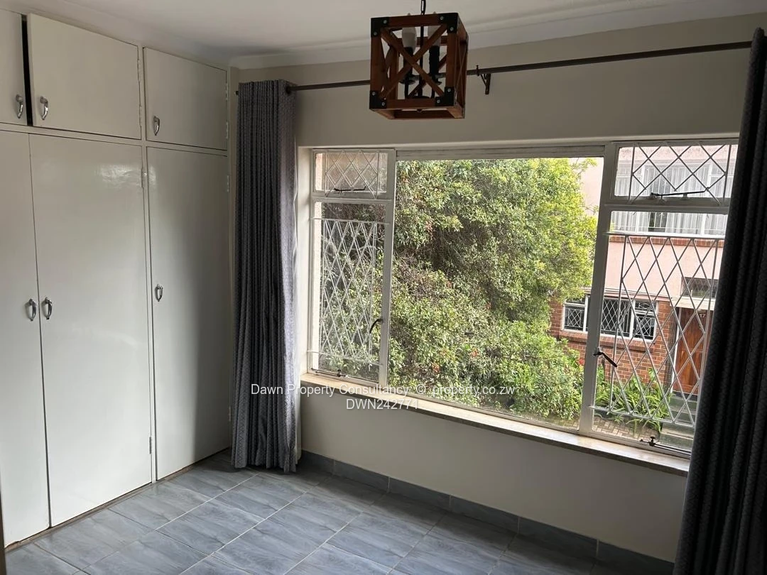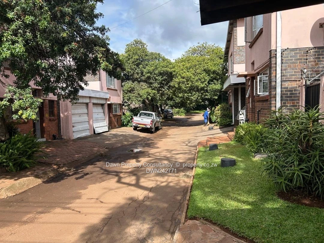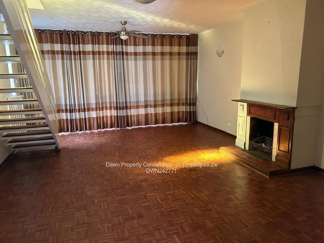 Charming 2-bedroom, 1-bath flat for rent in sought-after Avondale (Harare North). Set in a quiet, tree-lined complex with single garages and paved driveways, this duplex-style apartment greets you with a generous open-plan living area featuring polished parquet floors, a cosy fireplace, large secured windows with curtains and a ceiling fan — perfect for entertaining or relaxed family living. A modern kitchen has crisp white cabinetry, marble-look tiled walls and dark stone countertops for a fresh, practical finish. Upstairs the two bedrooms are bright and well-proportioned, served by a neat bathroom. Secure grounds, well-tended communal lawns and off-street parking add convenience. Important: the property is supported by a borehole, giving reliable water supply. Ideal for professionals or a small family seeking comfort and security in central Avondale — contact us to arrange a viewing.
